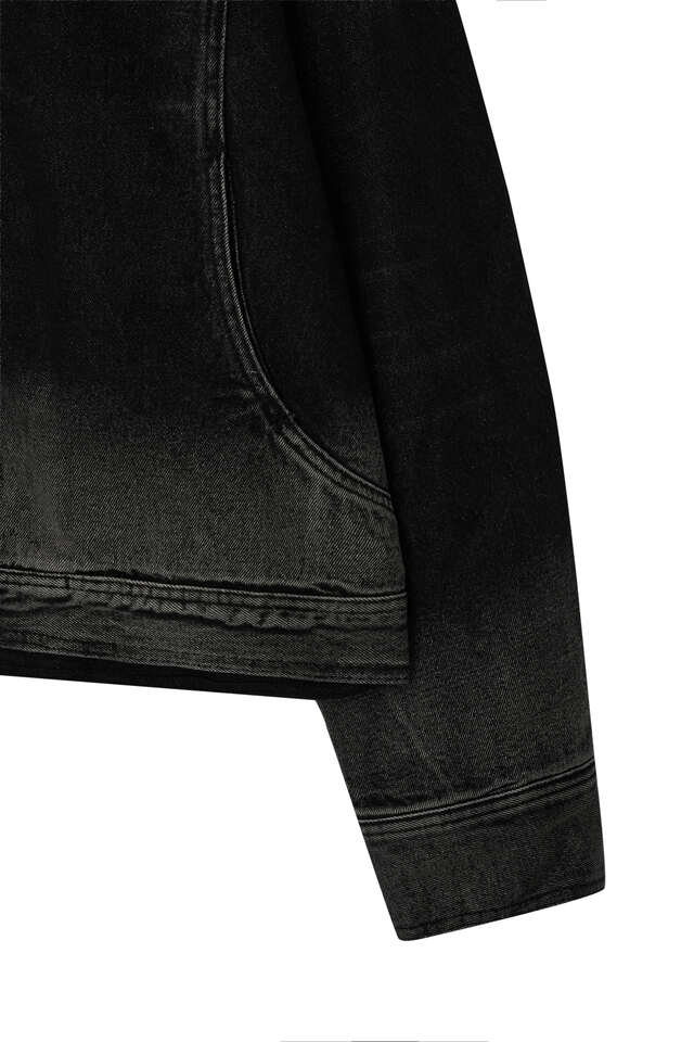 This is a hooded zip-up jacket featuring black and grey as the base colors, enhanced with a gradient effect through brushed washing on the hood, hem, and sleeves. It’s a trucker-style piece highlighted by pocket details that follow the shoulder line.