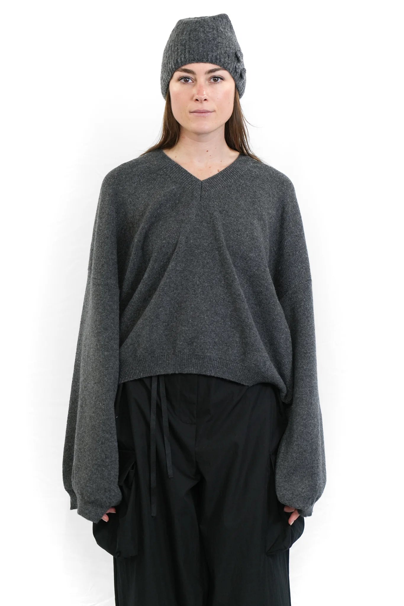 The CHARCOAL GREY OVERSIZED V-NECK KNIT SWEATER embodies understated comfort with an effortlessly relaxed silhouette. Crafted from a soft wool-blend knit, it features a deep V-neckline and dropped shoulders that accentuate its laid-back, slouchy shape.