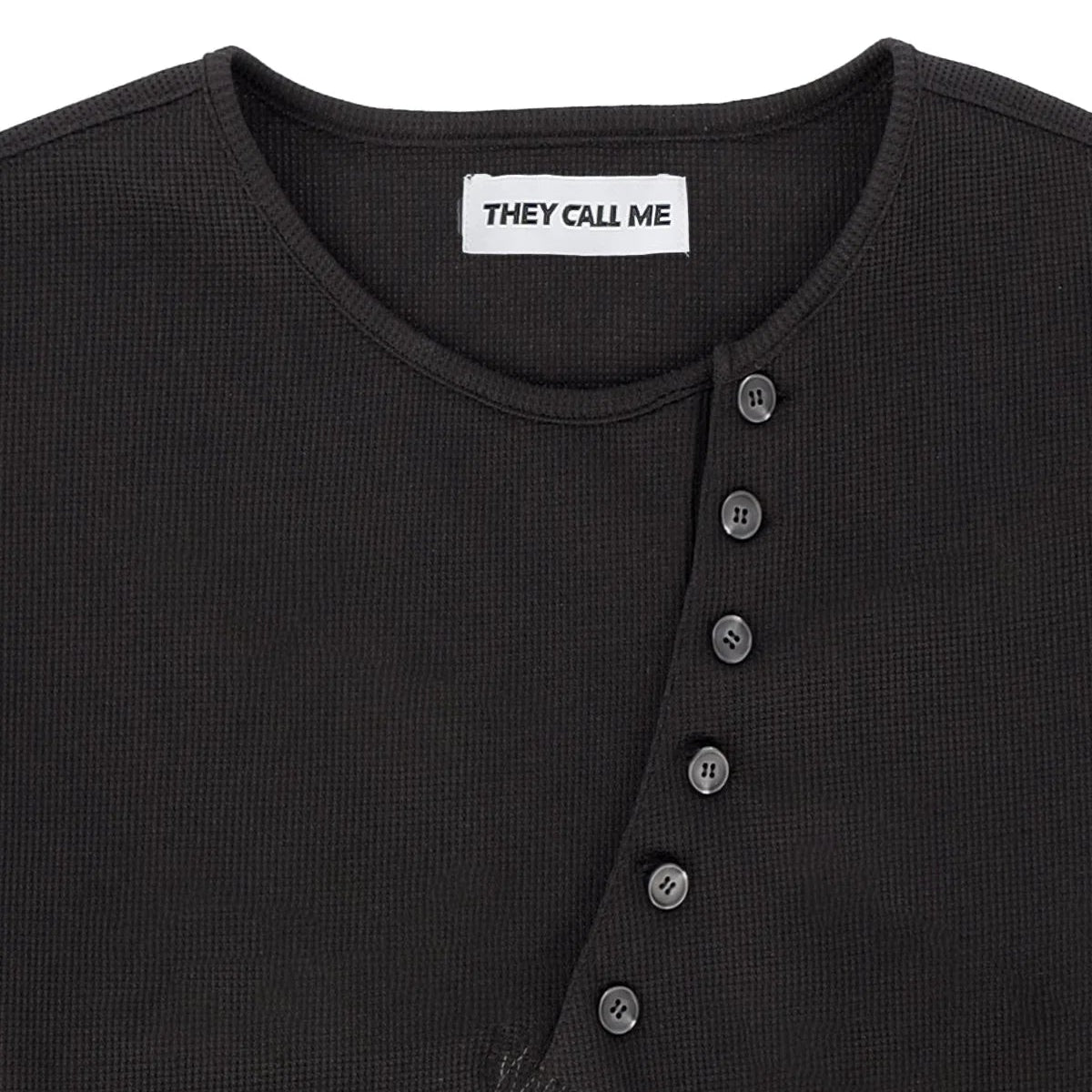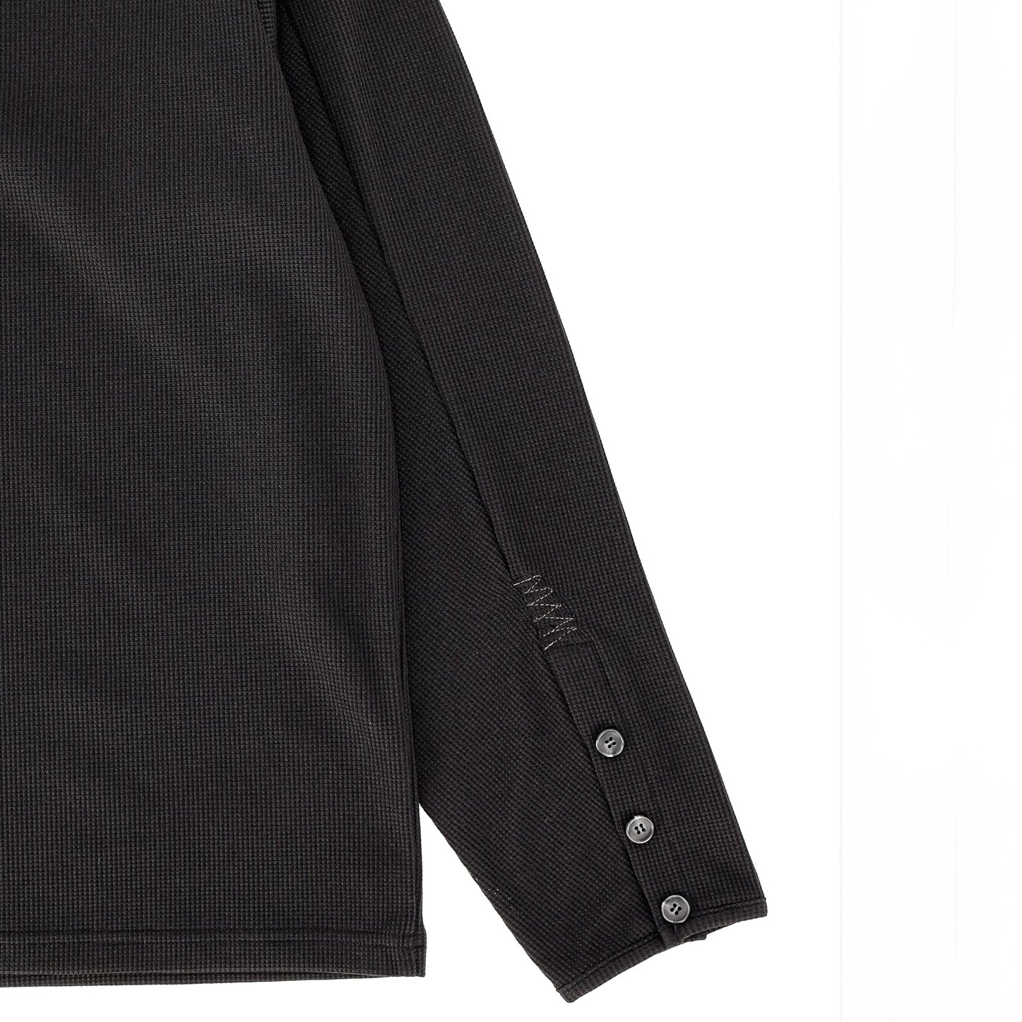 A waffle-textured henley neck complete with rearranged closures and sleeves and stitched accents.