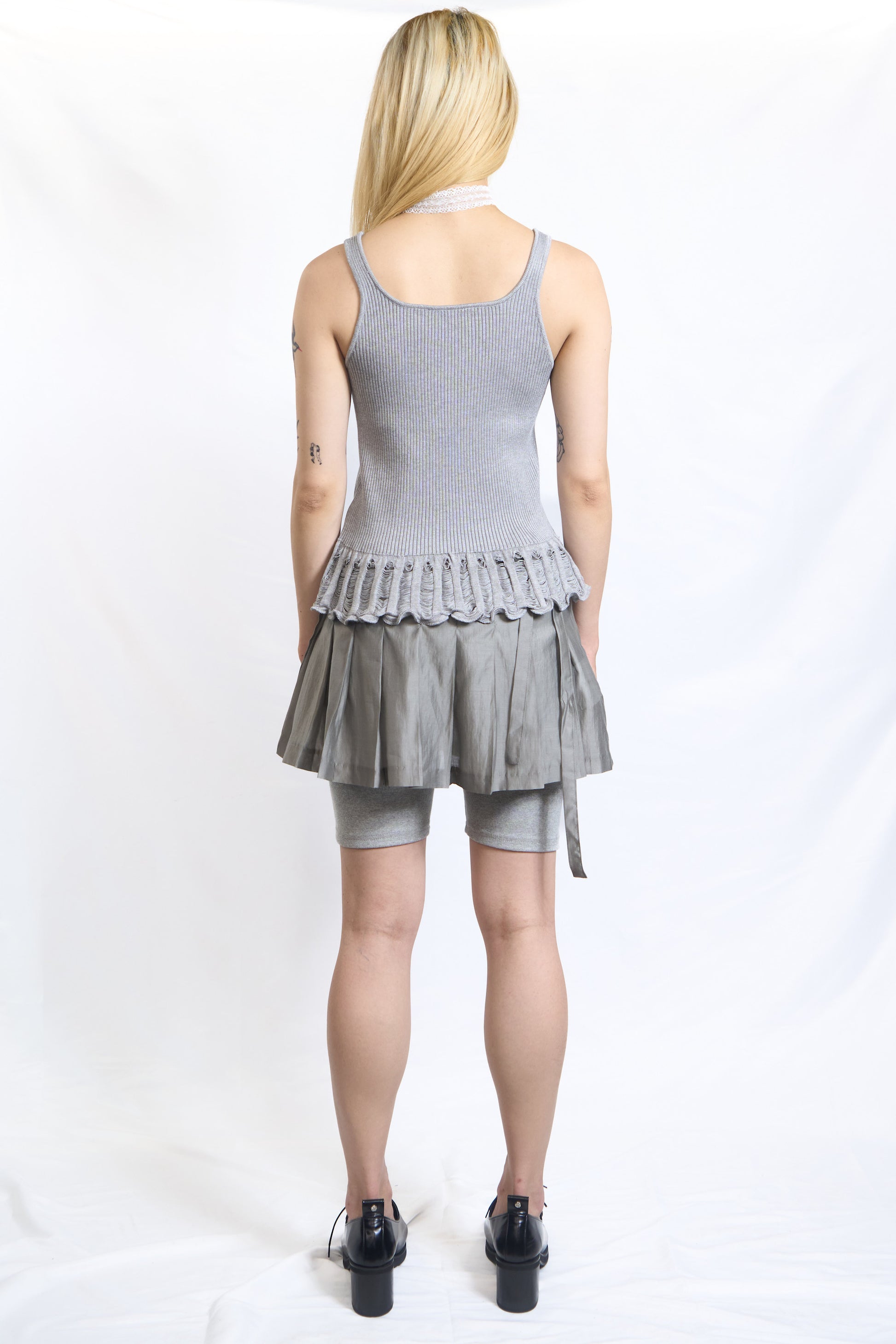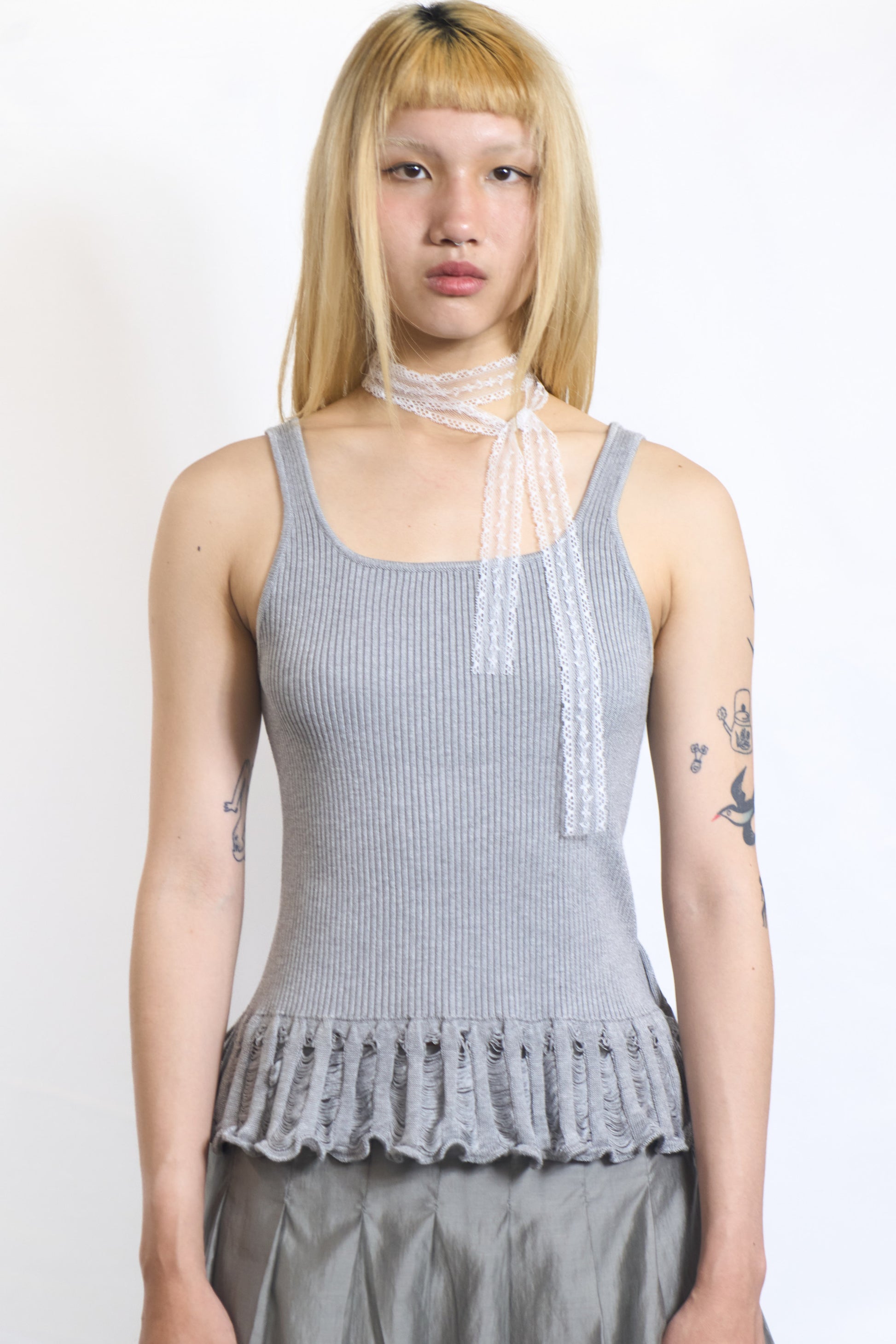 Minimal up top, movement below. This ribbed tank top hugs the body with a fine stretch knit and finishes with a sculptural cut-out hem — gently frilled and distressed for a soft edge. A modern staple with subtle drama, perfect for layering or wearing solo.