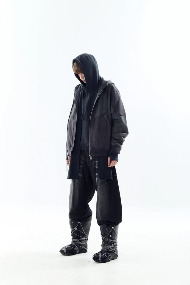 Destroyed Leather And Linen Hoodie Zip-Up Jacket
