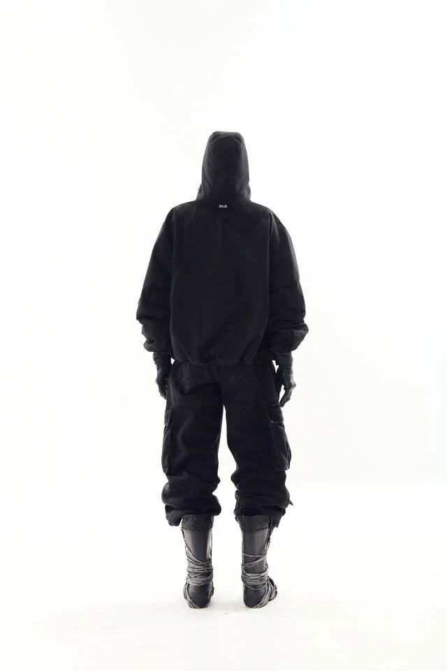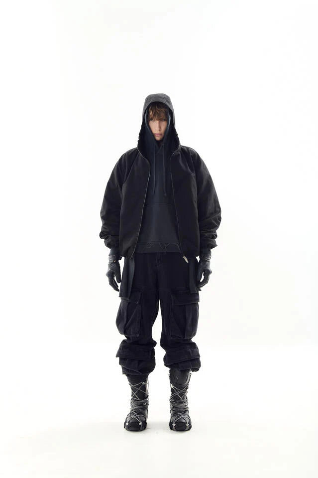 This hooded jacket features curved cuts and mesh panels for a stylish accent. The adjustable hood and hem drawstrings allow for a customizable fit, while the mesh lining adds comfort. A shining zipper (Noble Shining Zipper) serves as a luxurious detail, and the back is finished with a signature denim label.