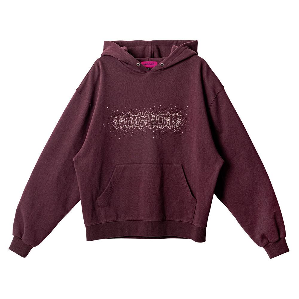The Rhinestone Mellow Graphic Hoodie features a vintage hue with a central rhinestone hotfix logo, oversized fit, and bold back typography season graphic.